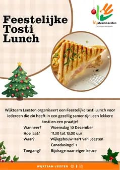 1 keer in de maand komt Tante Tosti in het wijkgebouw om de heerlijkste tosti’s te maken. Tussen 11.30 en 13 uur kun je lekker mee smullen. Aanmelden van tevoren is fijn, dit kan via info@wijkteamleesten.nl