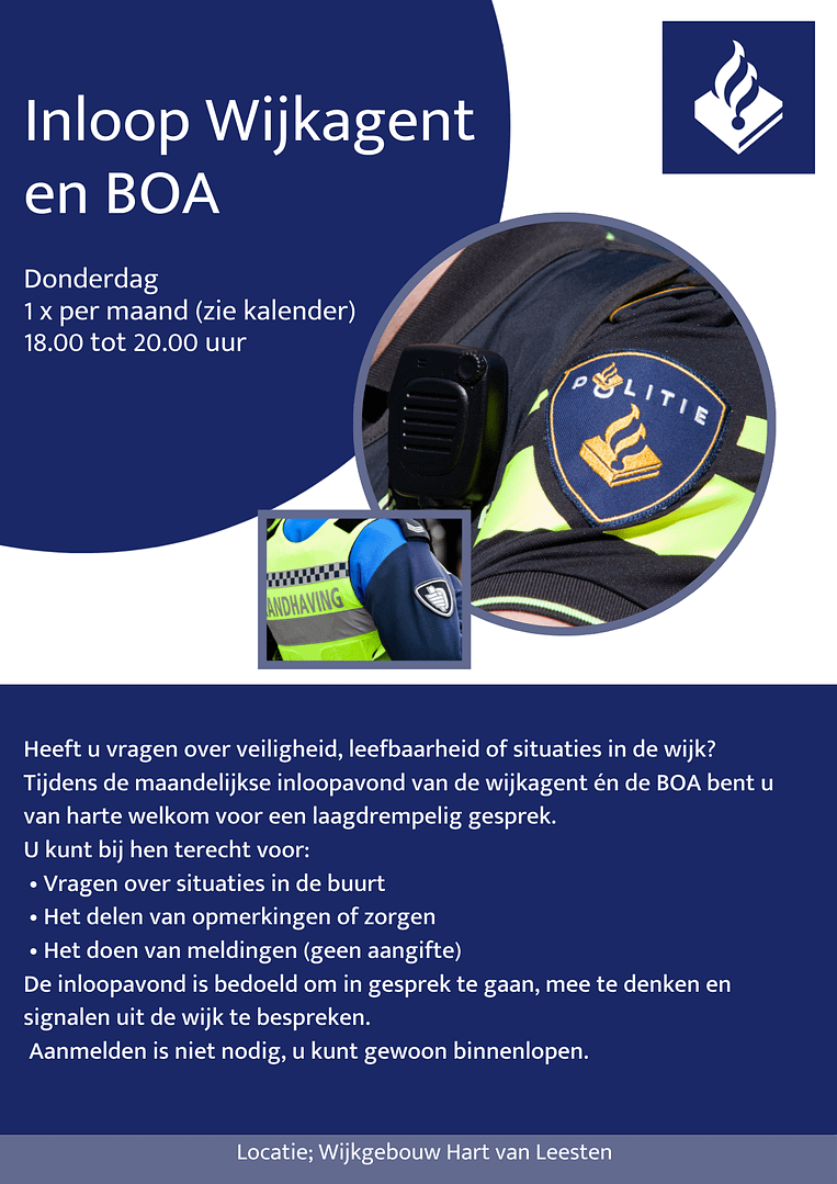 2 keer per maand houdt wijkagent Lizette en BOA Liane een inloop in ons wijkgebouw van 18.30 tot 20.00 uur. Hier kunt u terecht voor vragen, opmerkingen en/of meldingen.